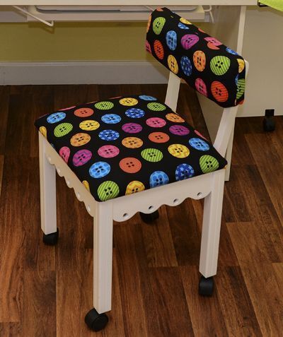 The chair’s height provides perfect lumbar support and it's soft, yet firm cushion is comfortable for those long sewing hours. Our chair features 4 casters for greater movement at your sewing cabinet or crafting surface. Lift the seat cushion up to reveal a hidden storage compartment for your small notions or patterns. Solid wooden legs and base make this a sturdy and beautiful addition to your room. Color choices include red, pink, green, black, and white.