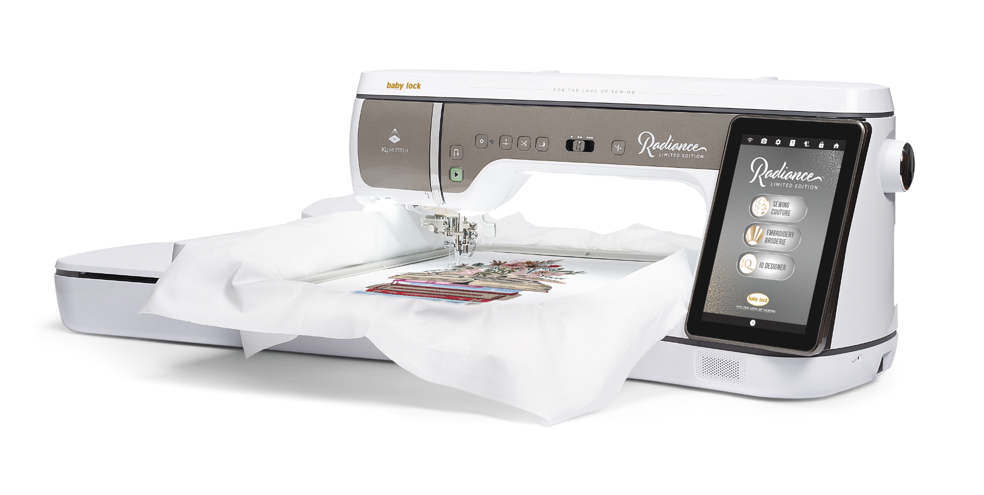 Where innovation meets excellence, the Baby Lock Radiance embroidery, quilting, and sewing machine takes your creativity to the next level. With the largest projection area featuring IQ Live Stitch™ technology, you can project designs and stitches directly onto your fabric for flawless placement every time. The expansive 11-5/8" x 18-1/4" embroidery hoop, IQ Designer features, and editing capabilities allow for grand, intricate designs, making your creative possibilities endless. Plus, advanced quilting features like StitchSync™ Regulation enable you to master a wide range of free-motion techniques.