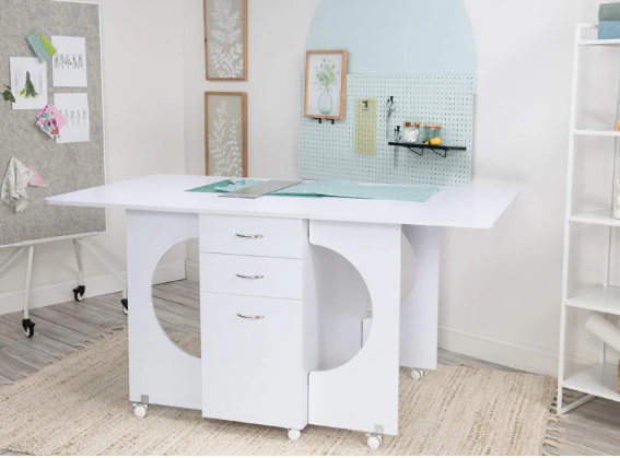 Maximize your workspace with this versatile Cutting Table: designed for sewists, by sewists. It's the perfect blend of functionality and flexibility: providing ample room for cutting fabric, assembling projects, or crafting with ease. When not in use, simply fold it down to save space. Three storage drawers keep your fabrics, patterns, and tools neatly organized, while the easy-roll casters allow for smooth mobility and stability. Comes fully assembled.