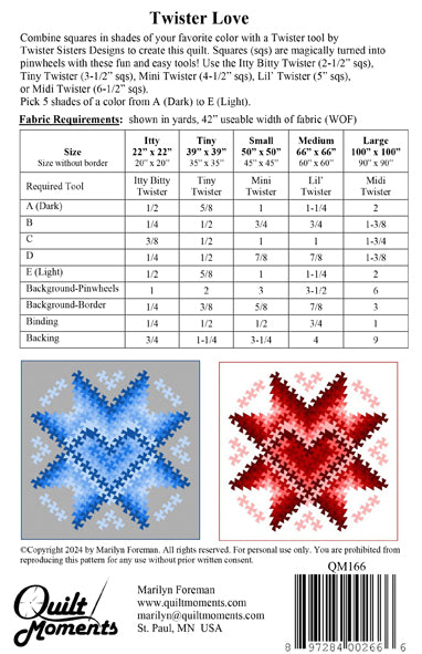 Combine squares in shades of your favorite color with a Twister tool to create this heart in a star quilt. Great gift for baby, wedding, Valentine’s Day, or anytime to spread some love. Perfect as a door hanging, wall hanging, crib quilt, throw quilt or bed quilt. A Twister© tool (Itty Bitty, Tiny, Mini, Lil’, or Midi) easily and magically turns squares into pinwheels. Full color booklet includes instructions for 5 size options.